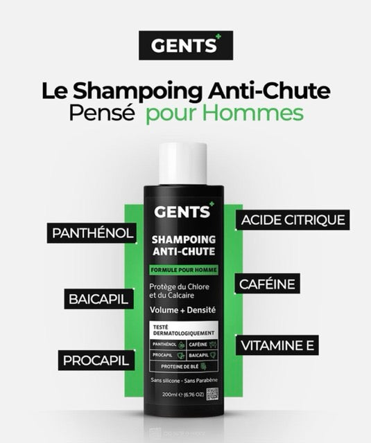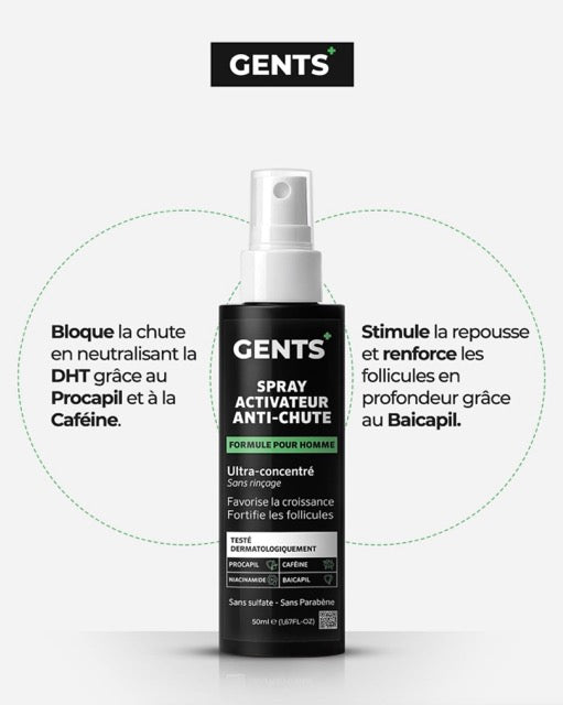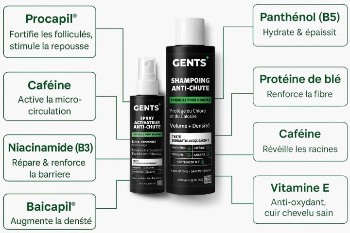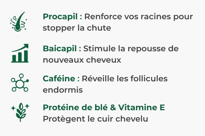 Procapil® bloque l’action du DHT → freine la chute. Caféine & Niacinamide → activent la micro-circulation et fortifient la fibre.
